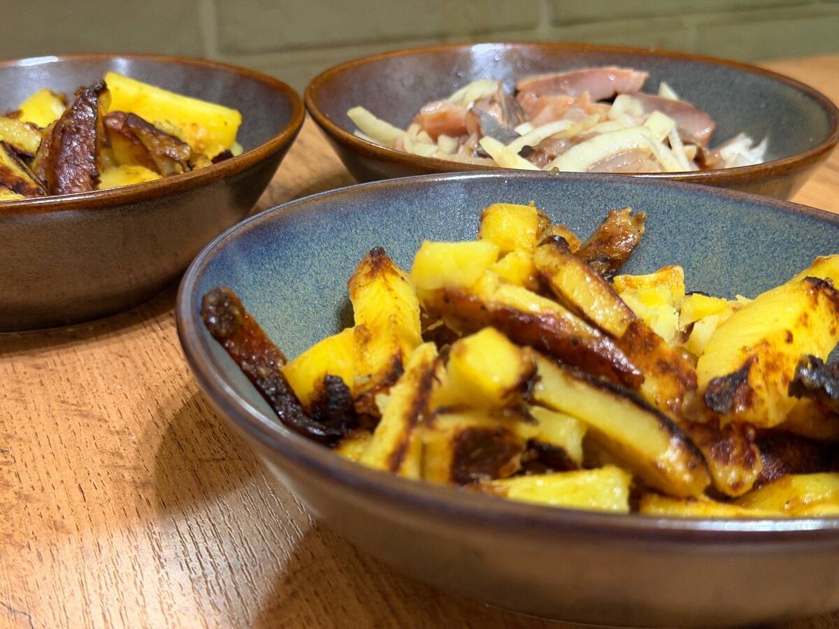 Идея пришла из одной статьи, где описывались необычные способы жарки картошки. В тот момент в холодильнике также обнаружилась немного соленой селедки, что стало отличным поводом попробовать этот метод на практике.