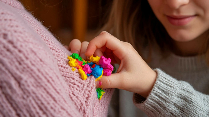 Сначала аккуратно снимают крупные куски, избегая трения. Затем вещь помещают в пакет и отправляют в морозилку, чтобы пластилин застыл и стал хрупким. После заморозки кусочки легко отделяются от ткани, и остается только небольшое жирное пятно.
