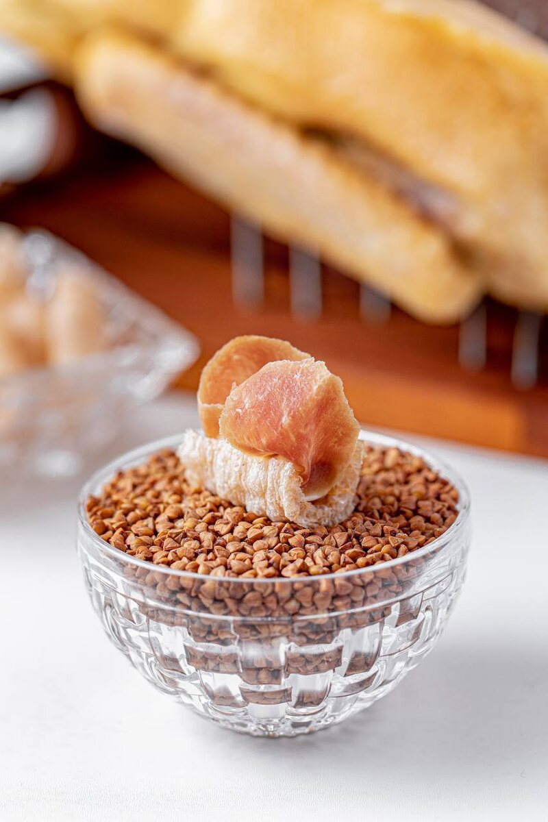 Показательное блюдо, включающее в себя гречневую трубочку, подготавливается с использованием современного пищевого экструдера. Этот кулинарный шедевр дополнен воздухом свежего томатного мармелада, богатой грибной сметаной и вяленым гусем, создавая удивительное сочетание хрустящих текстур и ярких ароматов.