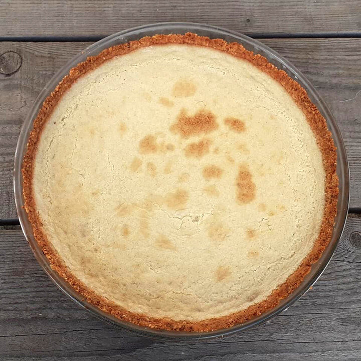 Теперь займитесь кремом: измельчите кешью в мелкую крошку. С лимона снимите цедру и выжмите сок. Смешайте измельчённые орехи, цедру, сок, растительное молоко и подсластитель, хорошо взбив венчиком. Вылейте крем на слегка остывший корж и готовьте снова при 160°C в течение 25-35 минут, пока поверхность не покроется аппетитной золотистой корочкой.
