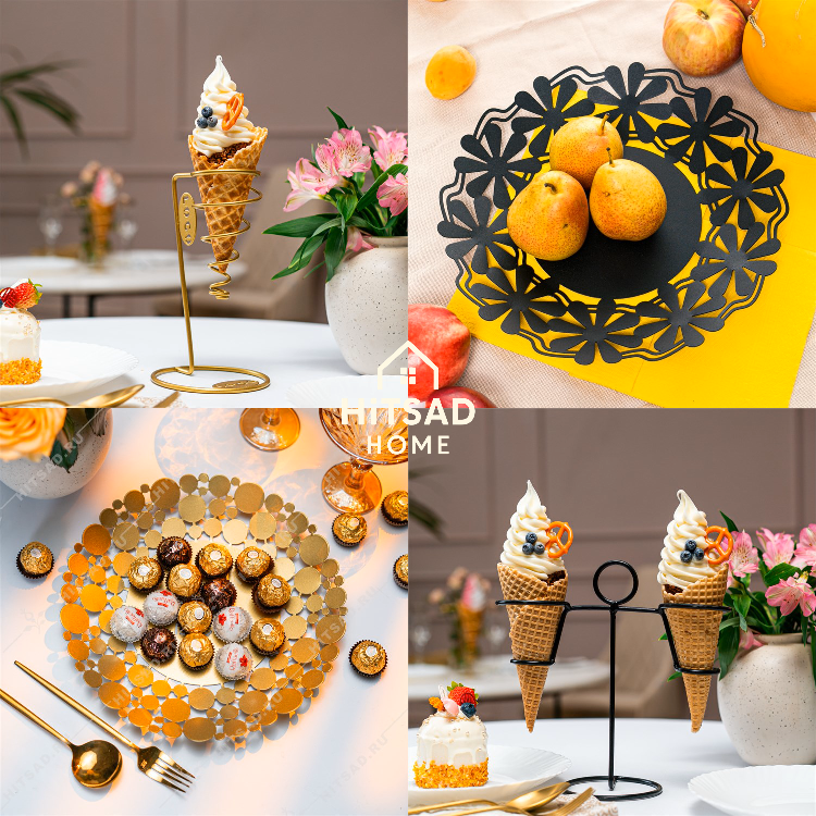Сервировочные подставки HiTSAD — это идеальный выбор для тех, кто ценит красоту в простоте. Металлические держатели и корзины идеально подойдут для подачи мороженого, закусок, тарталеток и снека. Компактный и стильный дизайн позволяет им органично гармонировать с любым интерьером — будь то минимализм или прованс.