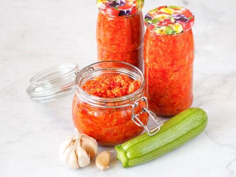 Эта закуска обладает мягким вкусом и легкой остротой. Кабачки и морковь придают сладость, а сочные перцы и томаты – необходимую влажность. Острый перец добавляет пикантный штрих, что делает эту аджику идеальной для обострения аппетита.