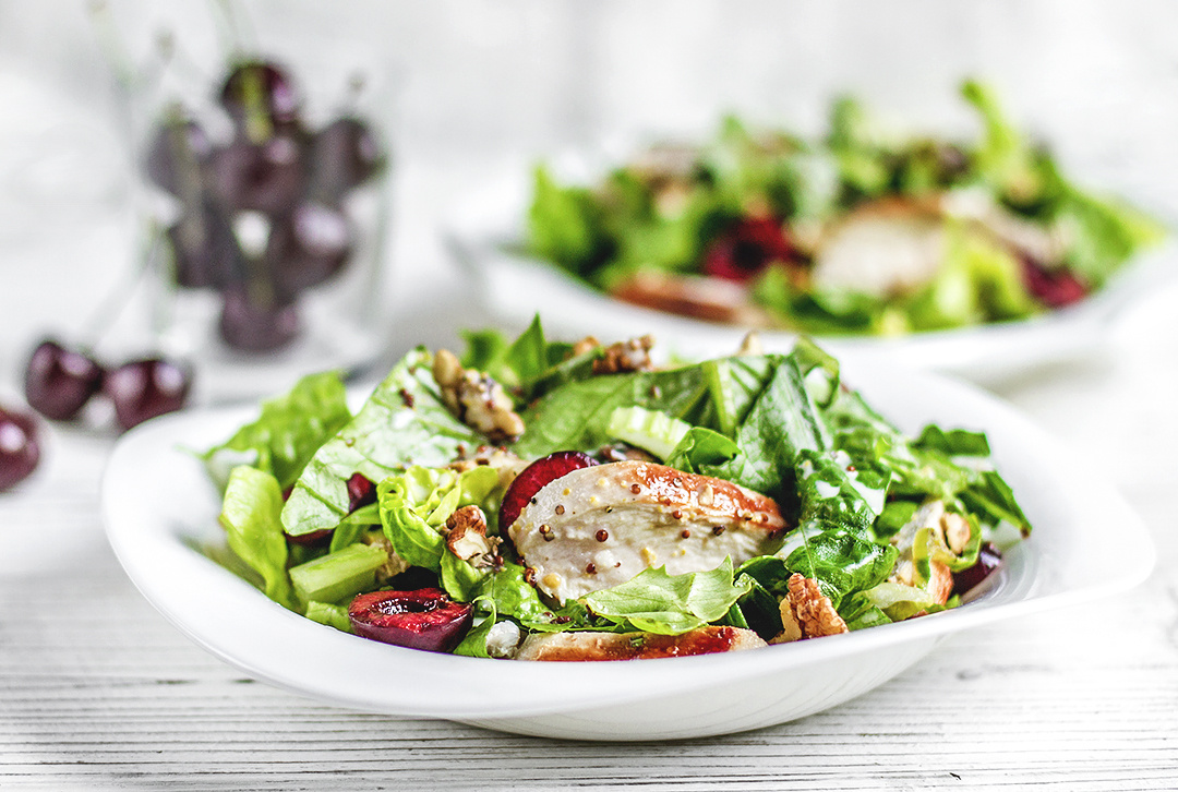Этап 2: В отдельной миске выдавите сок половины лимона, добавьте йогурт, горчицу и мед, тщательно перемешайте. Мелко нарежьте стебель сельдерея. Осмотрите грецкие орехи на наличие скорлупы и при необходимости удалите ее. Их можно слегка притолкнуть в пакете, чтобы измельчить, или нарезать ножом. Черешню разрежьте пополам и удалите косточки. В широкой миске соедините листья салата, ломтики курицы, орехи, сельдерей и черешню. Посолите и заправьте соусом, аккуратно перемешивая. Подавайте салат теплым, чтобы подчеркнуть все вкусовые ноты.