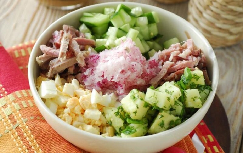 Картофель отваривается в мундире, очищается и нарезается. Зелень измельчается и смешивается с солью и специями. Яйца и малосольные огурцы нарезаются кубиками, свежие огурцы и редис натираются. Копченую курицу и листья салата нашинковать.