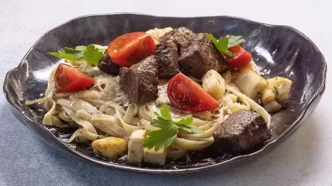 Затем, чтобы подчеркнуть вкус, используются итальянские травы и черный перец. Когда стейк готов, к нему добавляют отваренные макароны и немного воды из кастрюли. Для насыщенности можно добавить еще один кусочек масла и тщательно перемешать компоненты, чтобы они объединились в вкусный ансамбль.