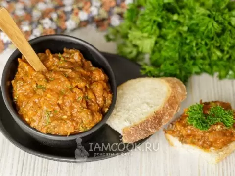 Когда баклажаны будут готовы, их мякоть нужно нарезать и добавить в сковороду с томатным соусом, продолжая готовить еще 7-10 минут. После этого вливается уксус, добавляются соль, перец, сахар и измельченный чеснок. На этом этапе можно добавить свежую зелень по желанию. После 2-3 минут на огне, намазка готова!