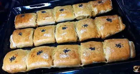Перед запеканием рулеты можно смазать взбитым желтком - это придаст им золотистую корочку. Разрезать на порции и отправить в разогретую до 180°C духовку на 20-25 минут. Пирожки должны быть румяными и аппетитными.