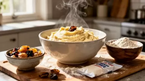 2. Замешивание теста: Утром изюм заливается горячей водой, а затем обваливается в муке. Опара должна быть пышной и ароматной. В неё добавляют остальные ингредиенты и постепенно вводят просеянную муку, вымешивая до консистенции мягкого теста.