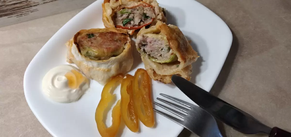 Теперь пора собирать запеканку. На край лаваша выкладывают обжаренные кабачки и ломтики запеченного перца, а затем распределяют фарш. Аккуратно сворачивают в рулет, нарезают на кусочки по 4-5 см и выкладывают в жаропрочную форму. Можно запеканку оставить в форме бублика — на вкус это не повлияет.