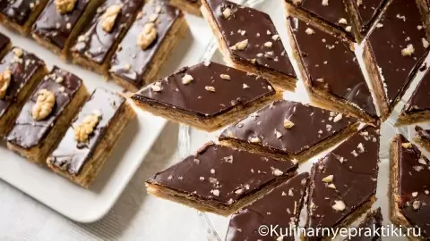 Когда пирожное остынет, приготовьте глазурь из воды, масла и сахарной пудры, добавив шоколад. После застывания нарежьте на порционные куски.