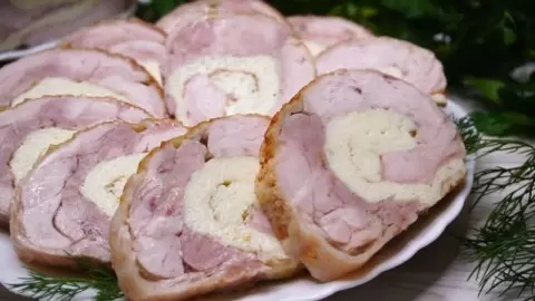 Ставьте на противень и готовьте в разогретой духовке при 200 градусах в течение 60-70 минут. Если планируете подавать его в горячем виде, можно подойти к подаче сразу. Однако можно также оставить рулет остывать в холодильнике на 4 часа для приготовления вкусной мясной нарезки.