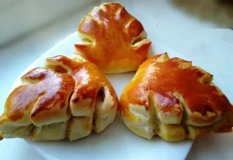 Разделите тесто на небольшие кусочки, раскатайте и заверните начинку, придавая форму треугольников. Выложите их на противень, дайте подняться и сделайте надрезы, чтобы булочки выглядели как листики. Смазывайте яйцом и выпекайте в предварительно разогретой духовке.