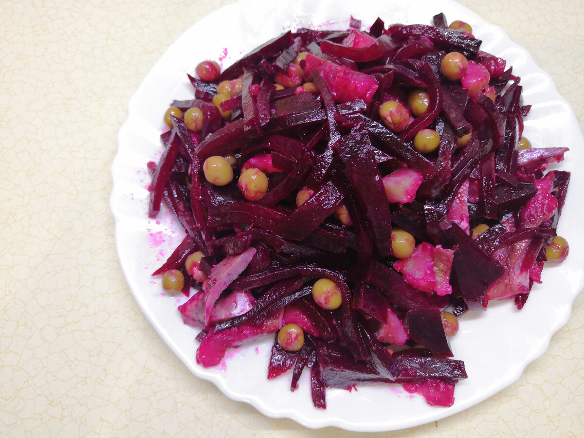 С селедкой все просто: лучше взять готовое филе в масле, чтобы не тратить время на его приготовления. 100 граммов филе нарезается также соломкой и добавляется к свекле. Для того чтобы разнообразить вкус, можно добавить 4 столовые ложки зеленого горошка — это придаст блюду яркие нотки. Заправлять салат дополнительно не требуется, так как селедка уже принесет необходимую соль и аромат. Для завершения — немного черного перца для оттенка.
