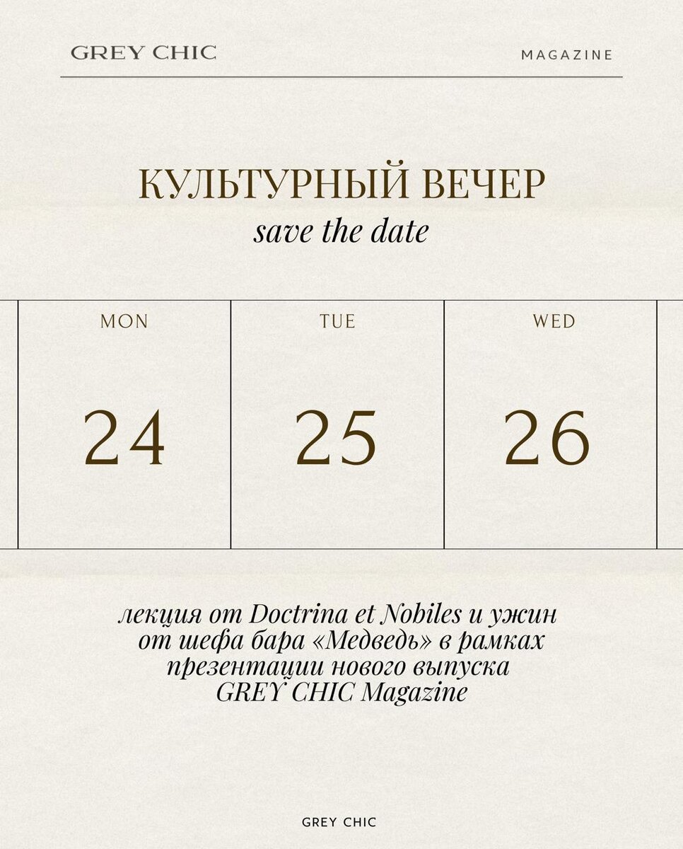 В этом месяце состоится долгожданный культурный вечер, который объединит лекцию от Doctrina et Nobiles и элегантный ужин от шеф-повара популярного бара «Медведь». Это событие посвящено презентации нового выпуска GREY CHIC Magazine.
