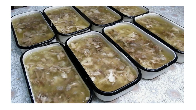 - Холодец имеет насыщенный, мутноватый бульон, который является результатом долгого варения. Бульон не подвергается осветлению, и в результате получается очень аутентичное мясное блюдо с кусочками мяса внутри.