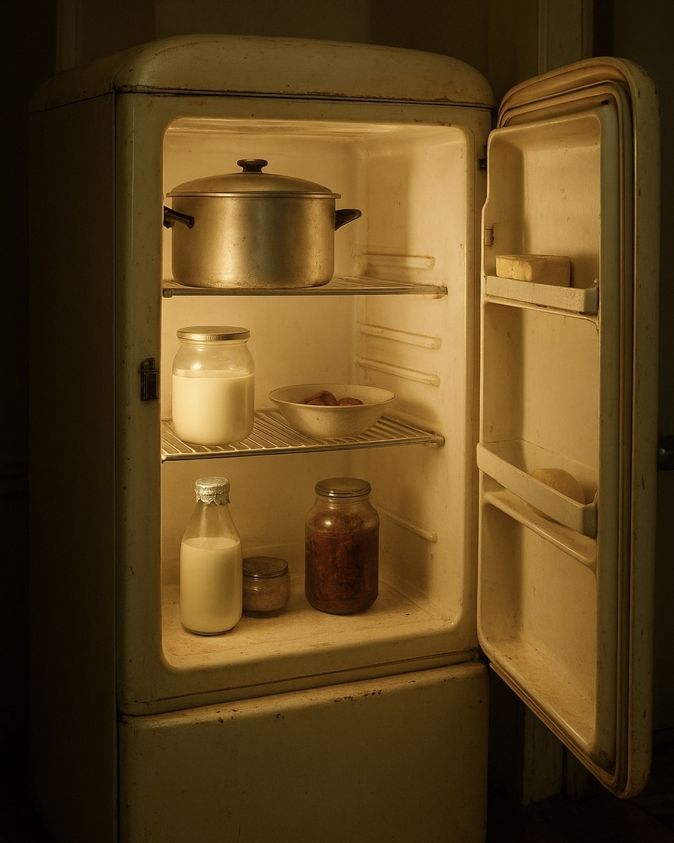 Каждый холодильник тех времён хранит уникальную историю. Вот, например, верхняя полка — настоящая сокровищница: молоко в стеклянной бутылке с фольгой на горлышке, сметана, купленная на развес в баночке с крышкой “на всякий случай”, и яйца, просто лежащие в миске. Срок годности не вызывал никакого беспокойства — все знали, что даже самые простые продукты вскоре превратятся в вкусный омлет.