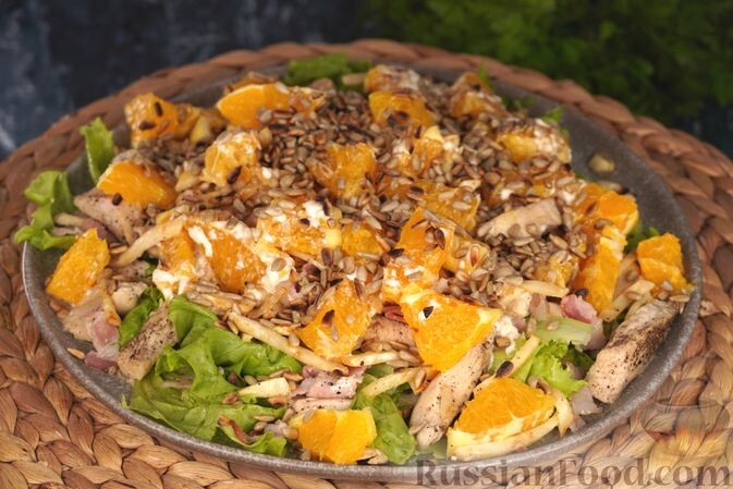 7. Салат с курицей и беконом. Если вы хотите поразить своих гостей, стоит обратить внимание на это сочетание. Обжаренное куриное филе в паре с апельсином и сельдереем удивит каждого своим оригинальным вкусом.