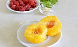 Если персики свежие и спелые, достаточно убрать с них кожицу, не подвергая термической обработке. Для более жестких фруктов рекомендуется бланшировать их в сахарном сиропе в течение 2-3 минут — после процедуры косточку и кожуру следует удалить. Свежие фрукты обеспечат идеальное сочетание вкусов, гармонируя с малиновым соусом и мороженым.