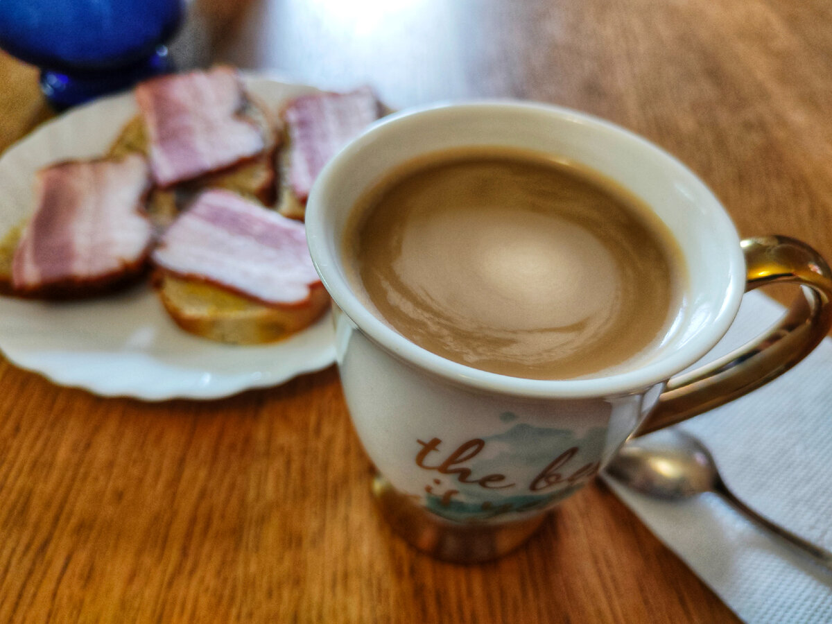 Воскресные утренние часы стоит начинать с чего-то особенно тепла. Предлагается заварить ароматный кофе с молоком и дополнить его хрустящими бутербродами с домашней горчицей и копченой свиной грудинкой. Эту горчицу легко приготовить самостоятельно и она не сравнится с магазинными версиями.