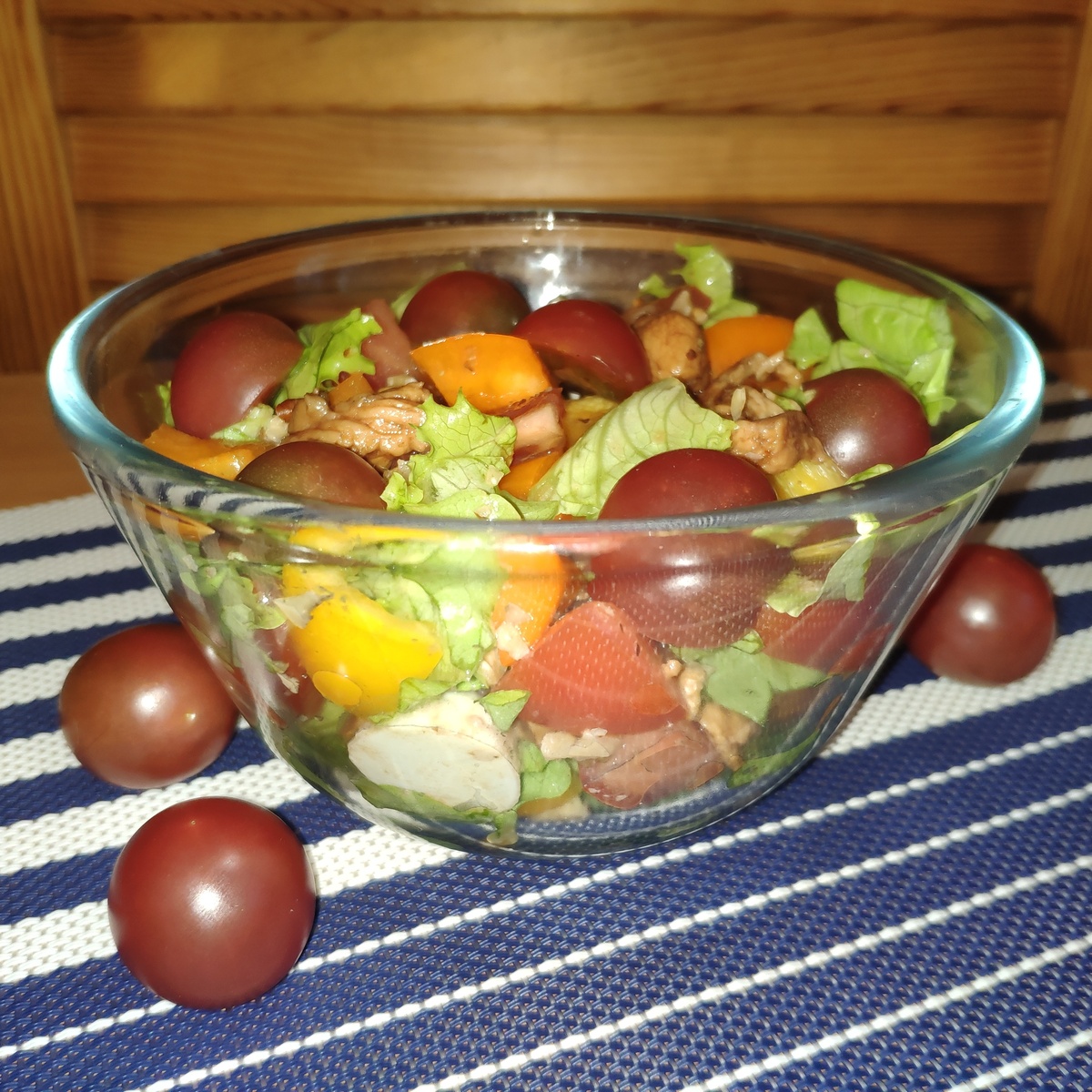 В то время как грудка готовится, грецкие орехи следует мелко нарезать, а шарики моцареллы, даже если они миниатюрные, стоит разрезать пополам. Овощи нарезают кубиками, а листья салата можно порвать произвольно.