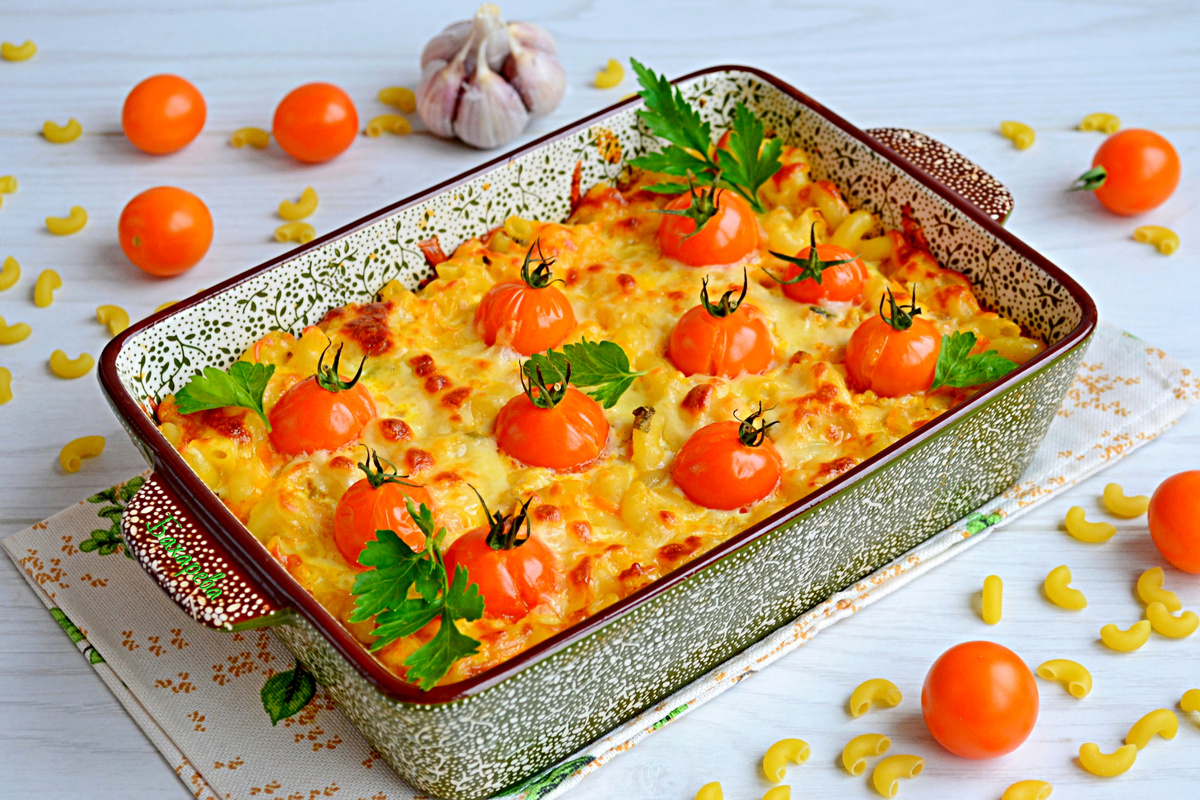 В завершение, сверху выложить помидоры черри и натертый сыр. Запекать в заранее разогретой до 180°C духовке около 30 минут до получения золотистой корочки.