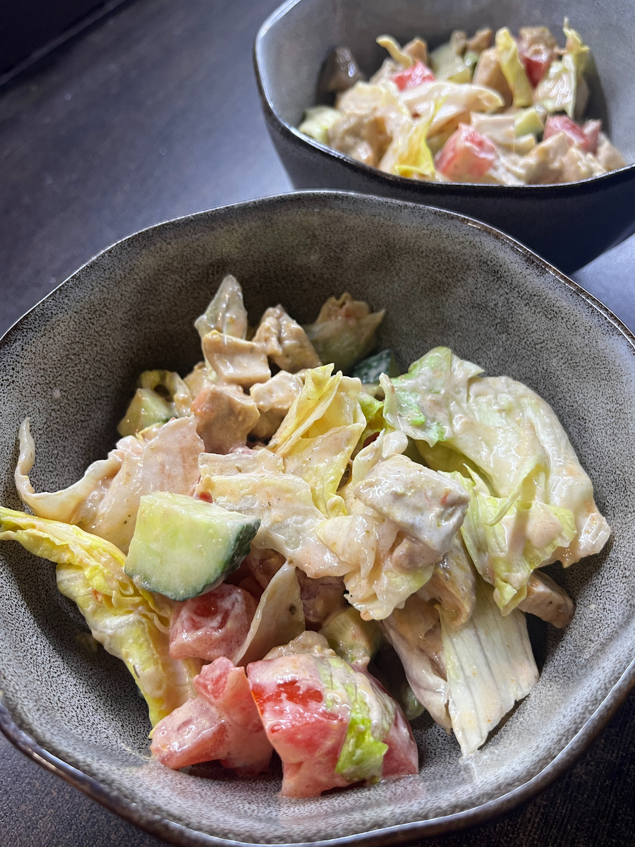 Для маринада курицы примените кефир с паприкой, чесноком и карри. Замариновав мясо на два часа, запеките его в разогретой духовке около 30 минут. После запекания нарежьте на кубики и соедините с крупно нарезанными овощами. В этом рецепте вместо майонеза используется смесь сметаны и кетчупа — и это сочетание порадует даже самых требовательных гурманов.