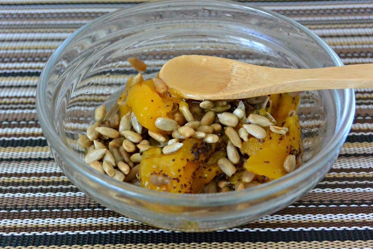 Как только тыква подрумянится, достаем её, посыпаем семенами подсолнечника и добавляем каплю меда для сладости.