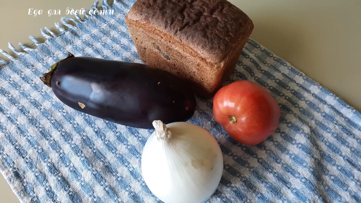 Первым делом нарежьте баклажан тонкими слайсами, посолите и оставьте на 10 минут, чтобы удалить лишнюю горечь. Лук следует нарезать полукольцами, а хлеб — на кусочки толщиной около 5 мм. После этого промойте баклажаны и тщательно обсушите их на полотенце.
