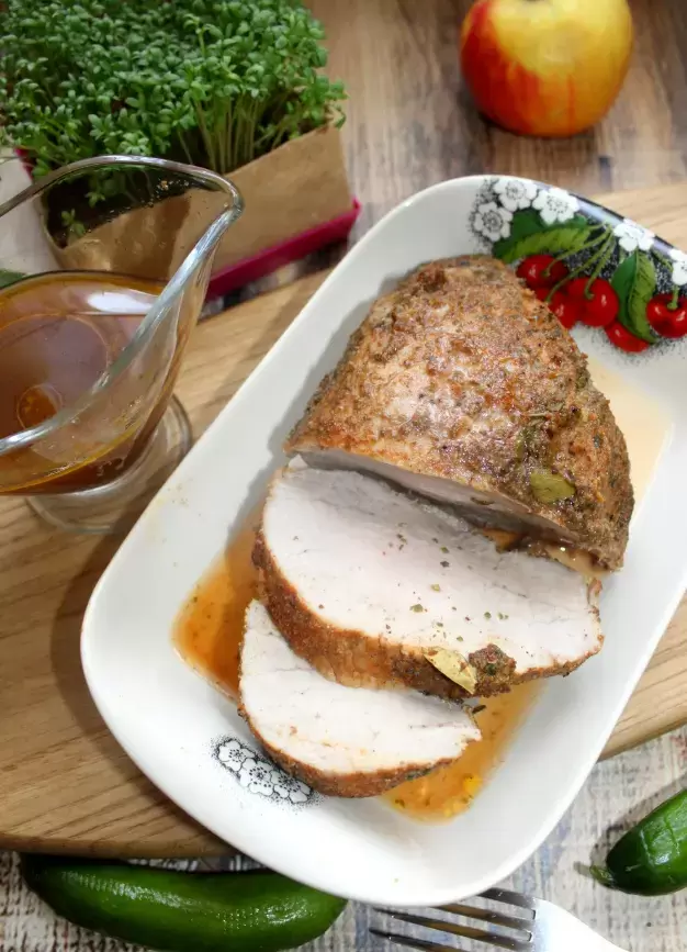 1. Начать следует с тщательной подготовки мяса: его необходимо вымыть и обсушить. Затем натереть смесью из соли, перца, паприки, чеснока и майорана. Такой маринад придаст свинине насыщенный вкус и аромат.