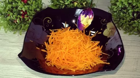 - Натереть морковь на крупной терке и смешать с прессованным или нарезанным чесноком.