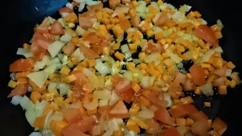 Начальную стадию приготовления можно начать с подготовки овощей. Лук и морковь нарезают небольшими кубиками и обжаривают на растительном масле вместе с измельченным чесноком до золотистого цвета. После этого добавляют нарезанный кубиками помидор, продолжают обжаривать, а затем вводят муку и тщательно перемешивают. Следующий шаг — влить немного воды, чтобы образовался соус.