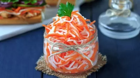 Маринованная морковь с дайконом — это не просто закуска, а настоящая находка, способная разнообразить любой стол. Эта вьетнамская классика удостоилась признания благодаря своей простоте и свежести. Во многих кафе и ресторанах Восточной Азии она неизменно гордо занимает место в знаменитом сэндвиче «Бан Ми», но ее применение гораздо шире. Сочетание кисло-сладкого маринада с хрустящей текстурой овощей привлекает к этому блюду внимание всех, кто пробует его. Это идеальный гарнир к мясным и рыбным блюдам, а также превосходная начинка для бутербродов.