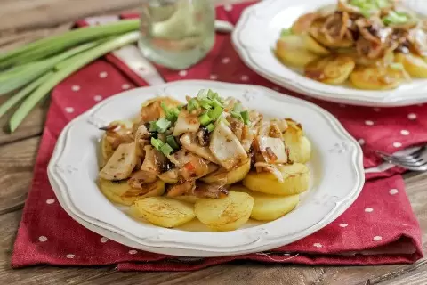 Шаг 4: На другой сковороде растопите сливочное масло, добавив немного растительного, чтобы предотвратить пригорание. Картофель нарежьте кружочками и обжаривайте на среднем огне по 3-4 минуты с каждой стороны до золотистой корочки. Подавать следует сразу же, сочетая картофель с кальмарами — это действительно восхитительная симфония вкусов!