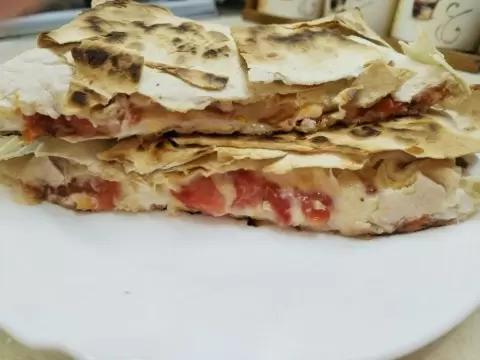 1. Сначала подготовьте сковороду, немного сбрызнув ее растительным маслом. Не включайте огонь, пока не соберете все ингредиенты в одном месте. Выложите лаваш так, чтобы его края свисали за пределы сковороды.