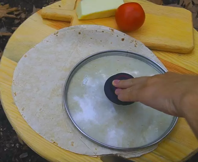 Первым делом необходимо подготовить лаваш, чтобы он идеально соответствовал размеру сковороды. Для этого с помощью кухонного ножа аккуратно вырезается круг нужного диаметра.