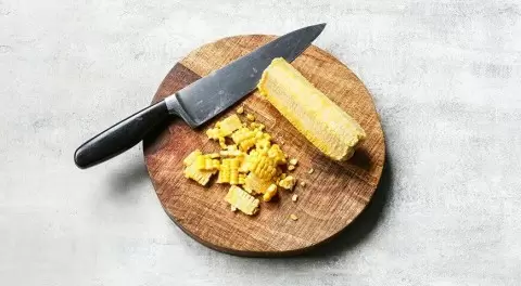 Первым делом подготовьте основные ингредиенты. Срезать зерна с початка кукурузы можно, поставив его вертикально на стол или в миску и проводя ножом вдоль. Как только благоуханный аромат кукурузных зёрен раздастся, переходите к нарезке овощей.