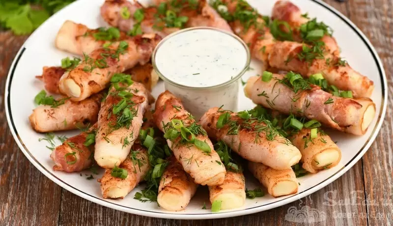 Сковорода разогревается без масла, закуски выкладываются швом вниз и жарятся, пока не будет достигнут желаемый уровень румяности. Сыр становится мягким и сливочным, создавая идеальное сочетание с копченым беконом.