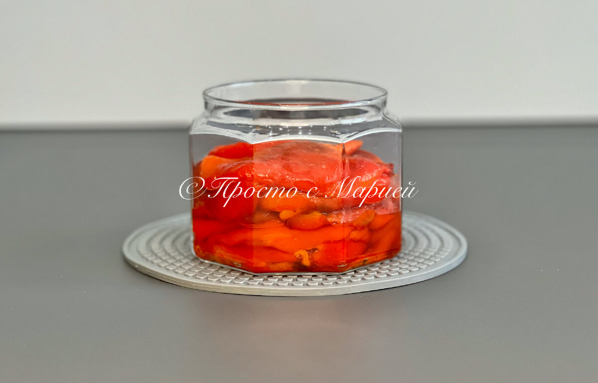 Готовые перцы следует перевести в контейнер и прикрыть крышкой на 10-15 минут. Это позволит им остыть, а шкурка легче отделится. После остывания переложите перцы в чистую баночку, не забыв при желании нарезать их на полоски.