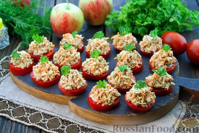 Не упустите возможность порадовать своих близких оригинальными закусками, такими как закуска из помидоров с консервированной рыбой и яблоком. Интересное сочетание консервированных сардин, свежих овощей и яблок приносит на стол яркие вкусовые нотки.
