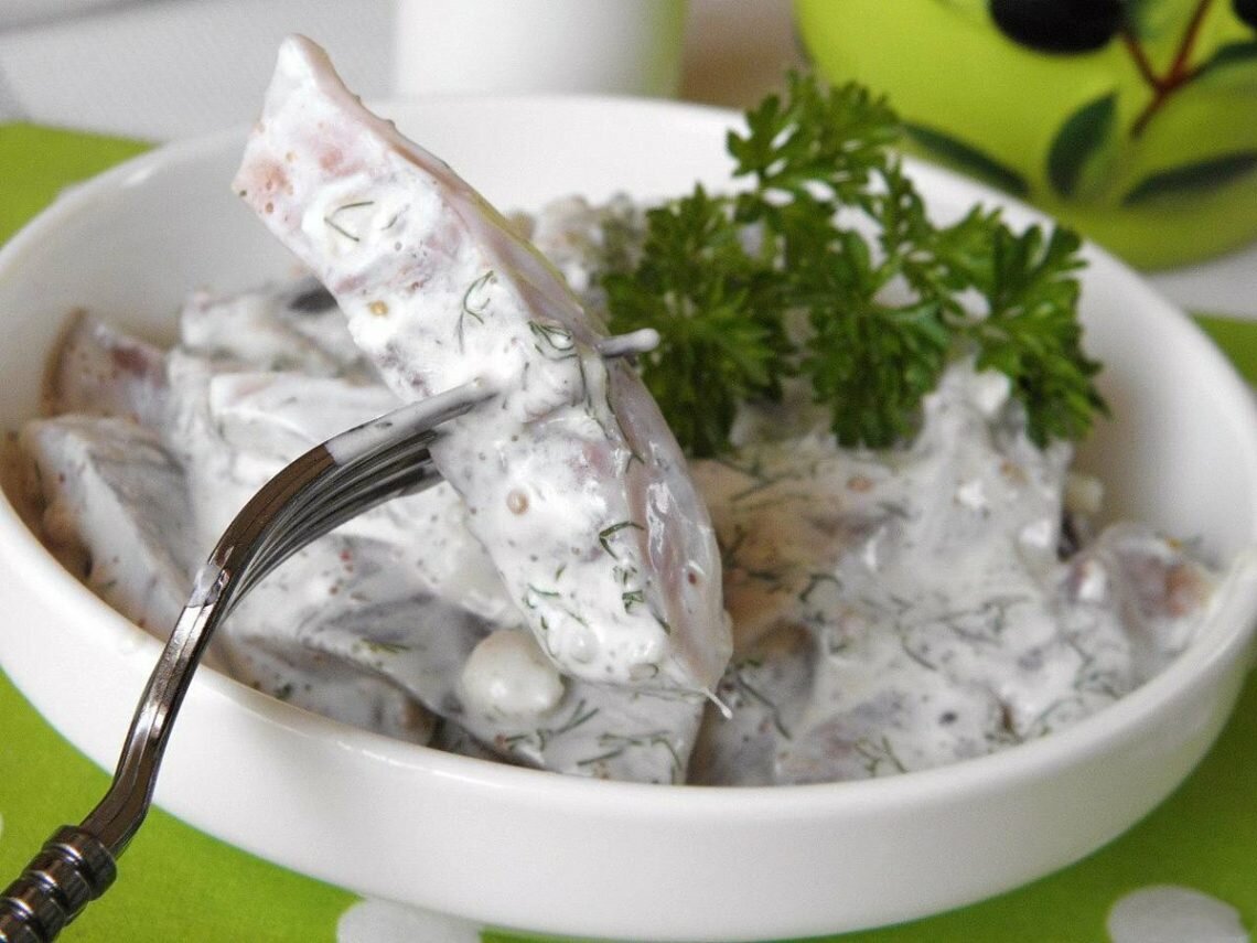 4. Полученным соусом заливаем сельдь, после чего помещаем закуску в холодильник на 2 часа. Это позволит рыбе хорошо пропитаться ароматами и стать еще более вкусной.