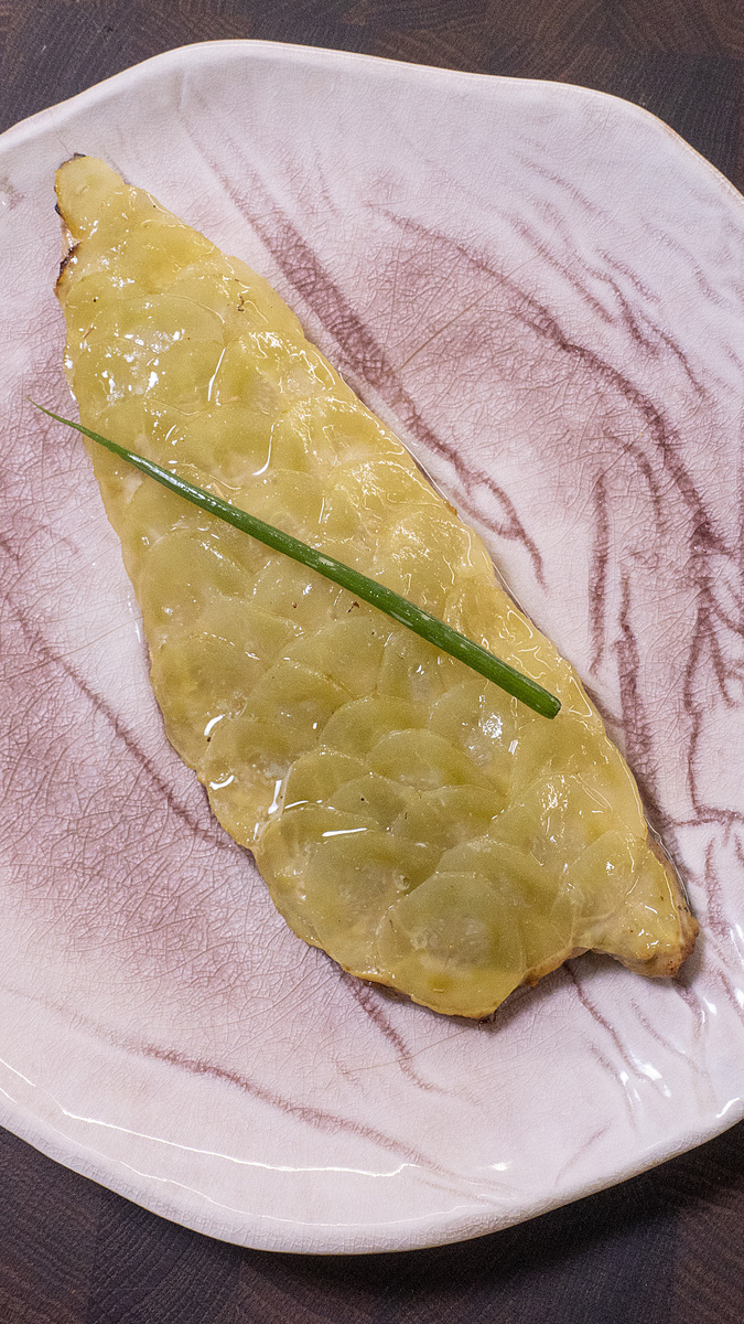 Эти огурцы помещаются внутрь рыбы, изобразив тем самым чешую. После этого скумбрию отправляют в разогретую до 230 градусов духовку, включая верхний обогрев. Готовится рыбка всего 7 минут, а перед подачей ее рекомендуется сбрызнуть оливковым маслом.