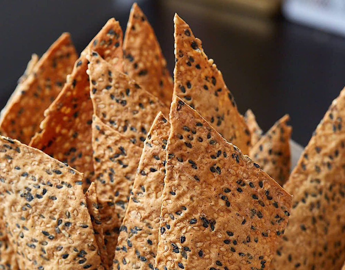Когда тесто готово, необходимо разогреть духовку до 180°C, а противни застелить бумагой. После этого обомните тесто, разделите на 2-3 части и раскатайте очень тонко (1-2 мм). На раскатанное тесто нанесите оливковое масло, затем щедро посыпьте смесью семян и специй. Выпекать нужно 10-15 минут до золотистого цвета, следя, чтобы не подгорели. После выпечки чипсы нужно дать остыть.